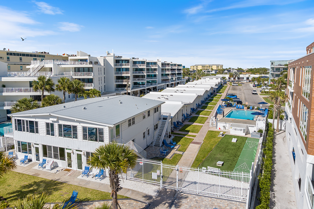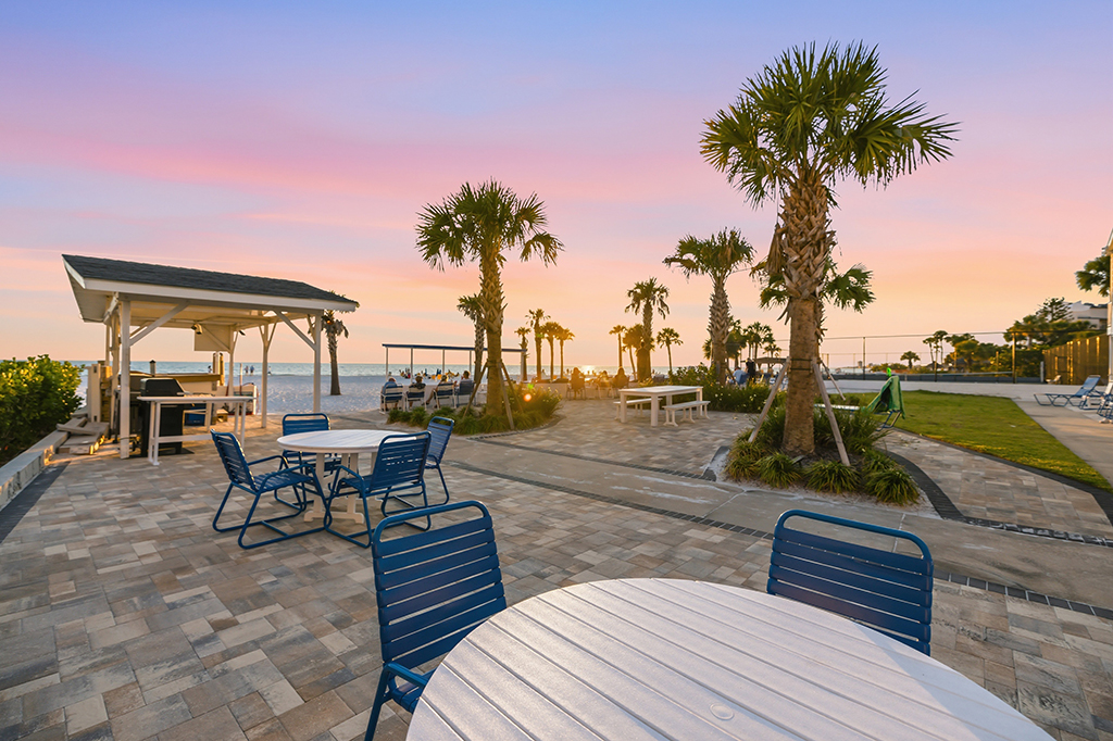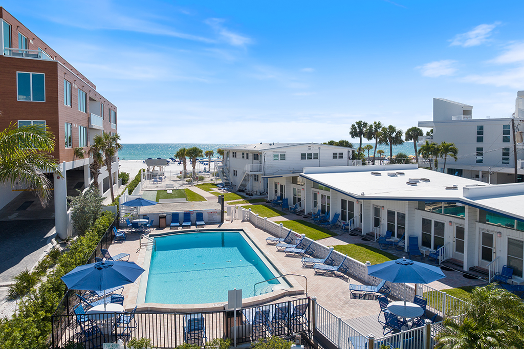 Our fully equipped kitchens allow for easy entertaining while making delicious home-cooked meals. The units have either a king- or a queen-bed and some also offer a twin-size bed in the bedroom. All units are furnished with a sofa bed in the living room. Some amenities include hair dryers, Keurig coffee makers, towels and linens, access to a shared coin operated laundry room, and on-site management. The units along Seaside Drive boast separate patio areas along Seaside Drive and in 2024, we expanded the patio area near the beach – a perfect spot to watch the spectacular sunsets of Siesta Key. There are gas grills behind the units on Seaside Drive as well as two gas grills and tables by the beach. We have a large, heated swimming pool with a new extension added on this past fall a shuffleboard court and cornhole set on turf.
