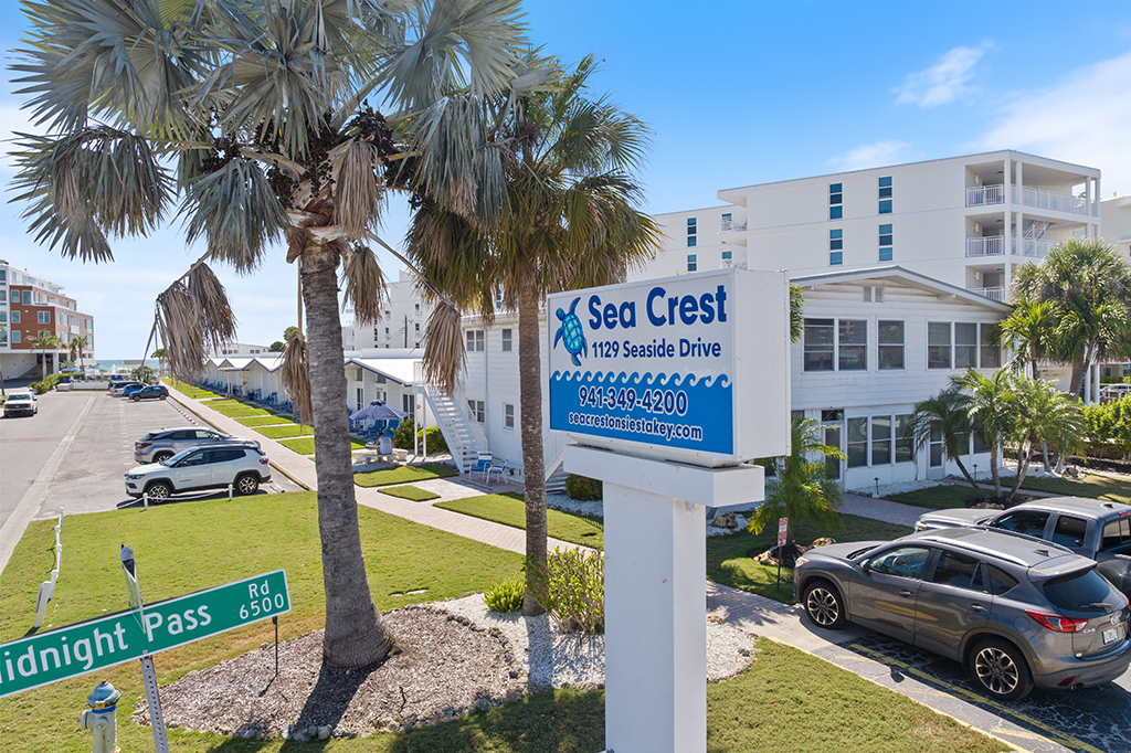 Sea Crest on Siesta Key is a modest 40-unit resort located on Seaside Drive; a quiet side street nestled between Midnight Pass Road and beautiful Crescent Beach. Our resort consists primarily of one-bedroom units with separate bedrooms, an efficiency unit, and a two-bedroom, two-bathroom unit. We offer the charm of a true old style Floridian resort offering guests the chance to stay just a few steps from our private gated entrance to the beautiful white quartz sands of Crescent beach just south of Siesta Key Beach.